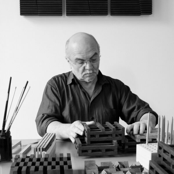 Originally his work consists of sober graphic art and monumental drawings, but in more recent years he has explored the dimensional possibilities of graphic art. He creates three-dimensional objects from wood, often painted in subdued colours that are characteristic of his earlier work: differentiated shades of grey and deep blacks. The work of Olivier Julia is focussed on the subtle interaction of closed versus open, of vertical versus horizontal and of light versus dark.